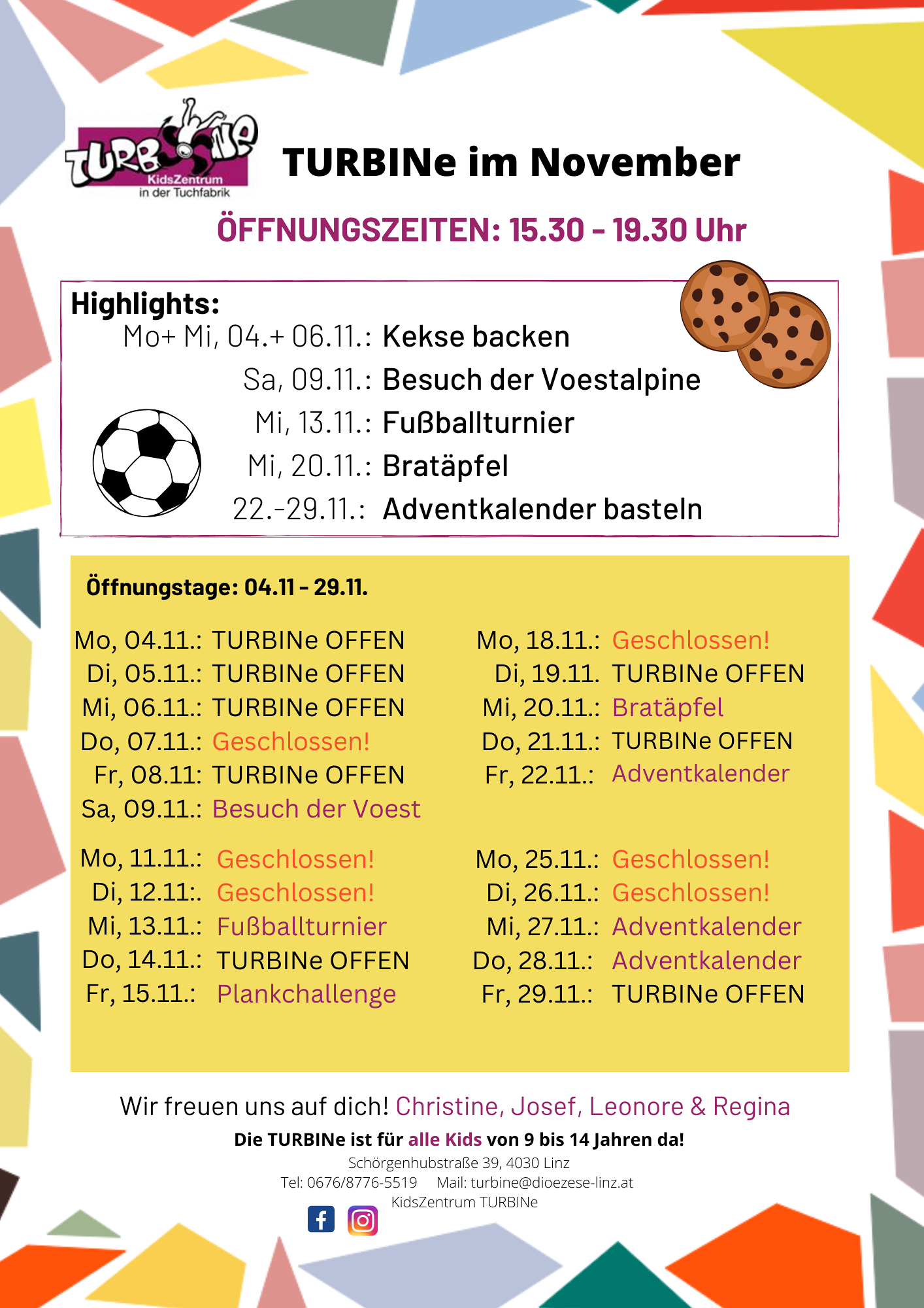 Monatsprogramm November Mit unserem neuen Team starten wir in den November! Freut euch auf abwechslungsreiche Aktivitäten. mehr: Monatsprogramm November