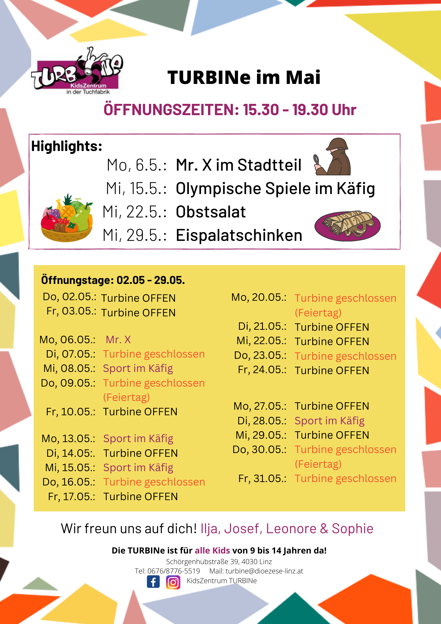Monatsprogramm Mai Im Mai gibt's in der TURBINe wieder viel Aktives und viel Kulinarisches - da ist für Jede*n was dabei! mehr: Monatsprogramm Mai