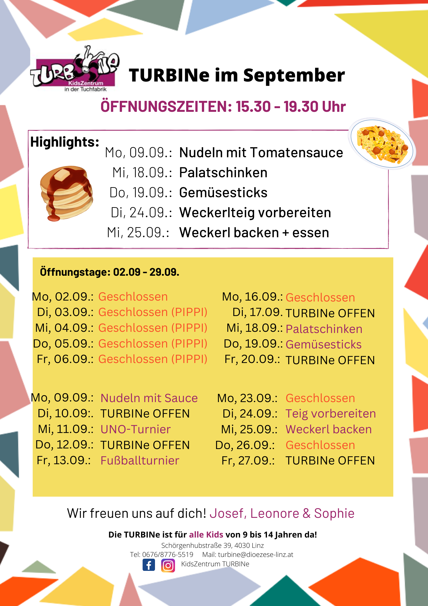 Monatsprogramm September Mit Schulbeginn nimmt auch die TURBINe wieder ihren Betrieb auf - freut euch auf ein sportlich-kulinarisches Herbstprogramm! mehr: Monatsprogramm September