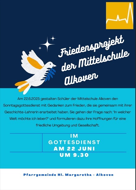 Am Sonntag 22. Juni gestalten Schüler der Mittelschule Alkoven den Sonntagsgottesdienst mit Gedanken zum Frieden, die sie gemeinsam mit ihrer Geschichte-Lehrerin erarbeitet haben. Sie gehen der Frage nach: "In welcher Welt möchte ich leben" und formulieren dazu ihre Hoffnungen für eine friedliche Umgebung und Gesellschaft!