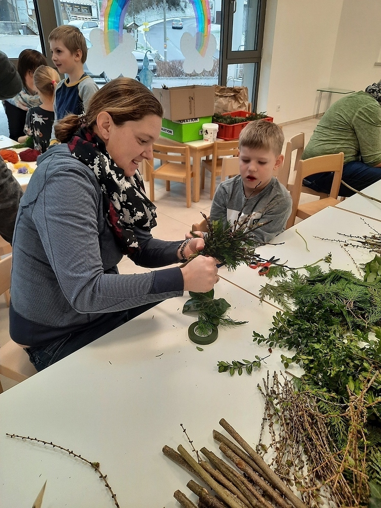 Nach langer Pause war heuer das Kinderliturgieteam wieder mit vielen fleißigen Helferinnen im Kindergarten und band mit jedem Kind einen Palmbuschen. Am Palmsonntag wurden die Palmbuschen geweiht.
