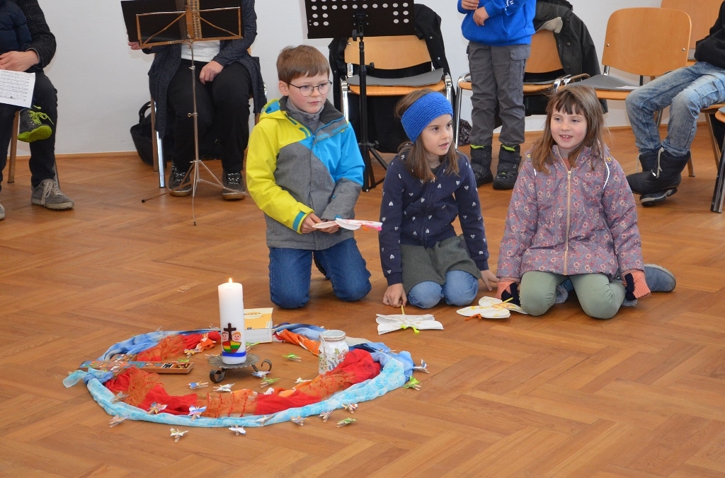 Seit vielen Jahren gestaltet das Kinderliturgieteam parallel zur Festmesse eine Kinderandacht. Nach dem beeindruckenden Einzug der Pferde und den Begrüßungen gingen die Kinder in den Chorraum zur Kinderfeier.