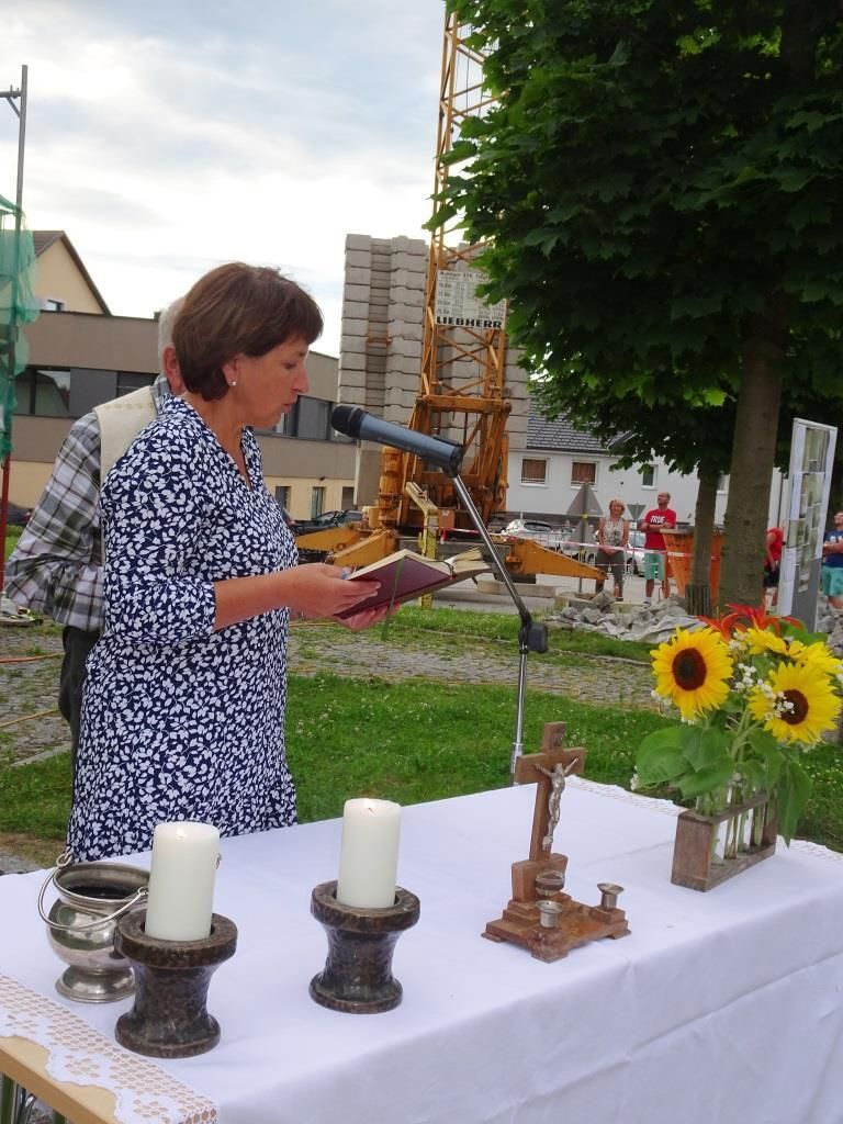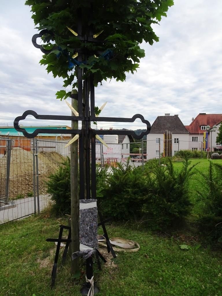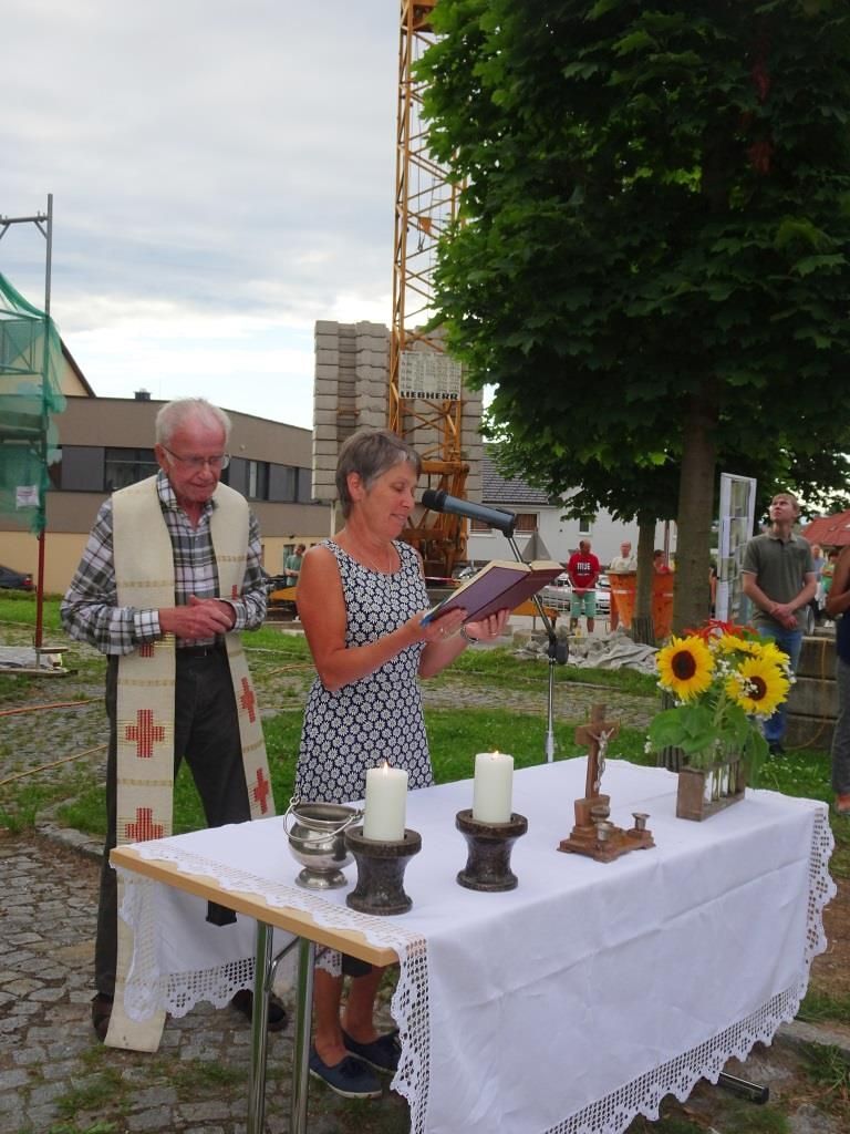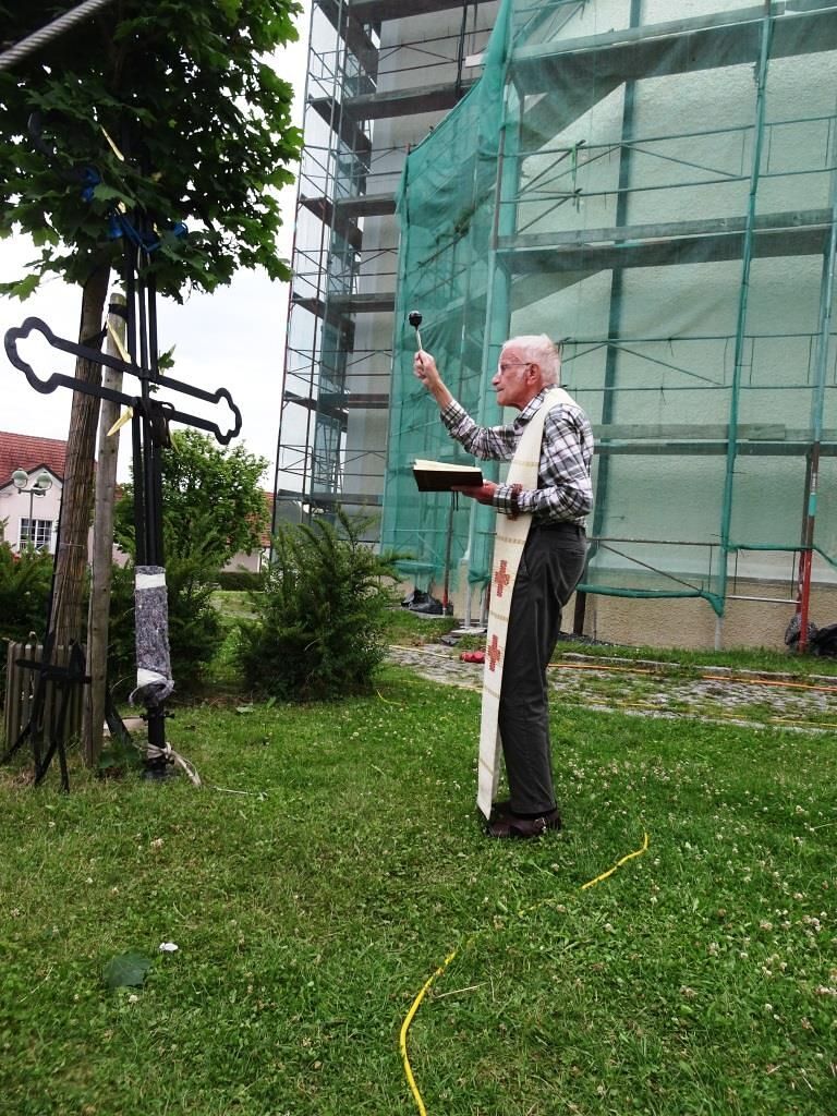 Nach dem Aufziehen der “goldenen” Kugel, in der sich die Zeitkapsel befindet, wurde in einer Andacht das Kreuz von unserem Altpfarrer Joe gesegnet.