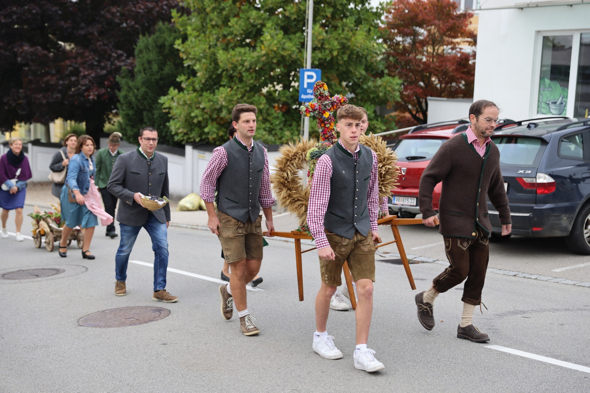 Nach der Segnung der Erntegaben beim Pfarrzentrum ging es im Festzug, angeführt von der Musikkapelle Ottnang-Manning zum Festgottesdienst in die Pfarrkirche.